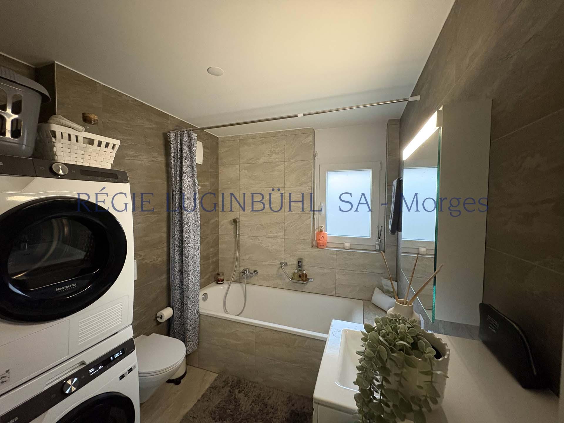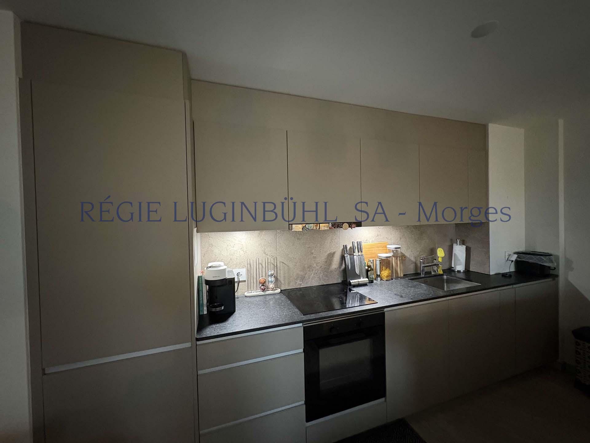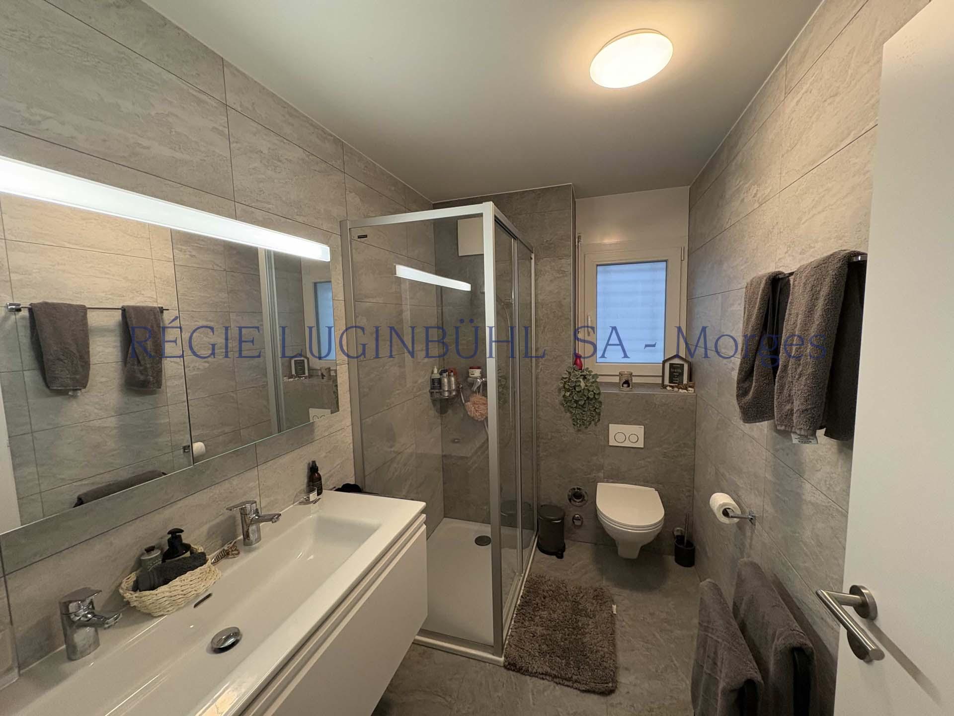 Bel appartement, moderne, de 3.5 pièces d'env. 83m3, au rez-de-chaussée d'un petit immeuble situé au centre du village d'Etoy, proche des arrêts de bus et des accès autoroutiers.
